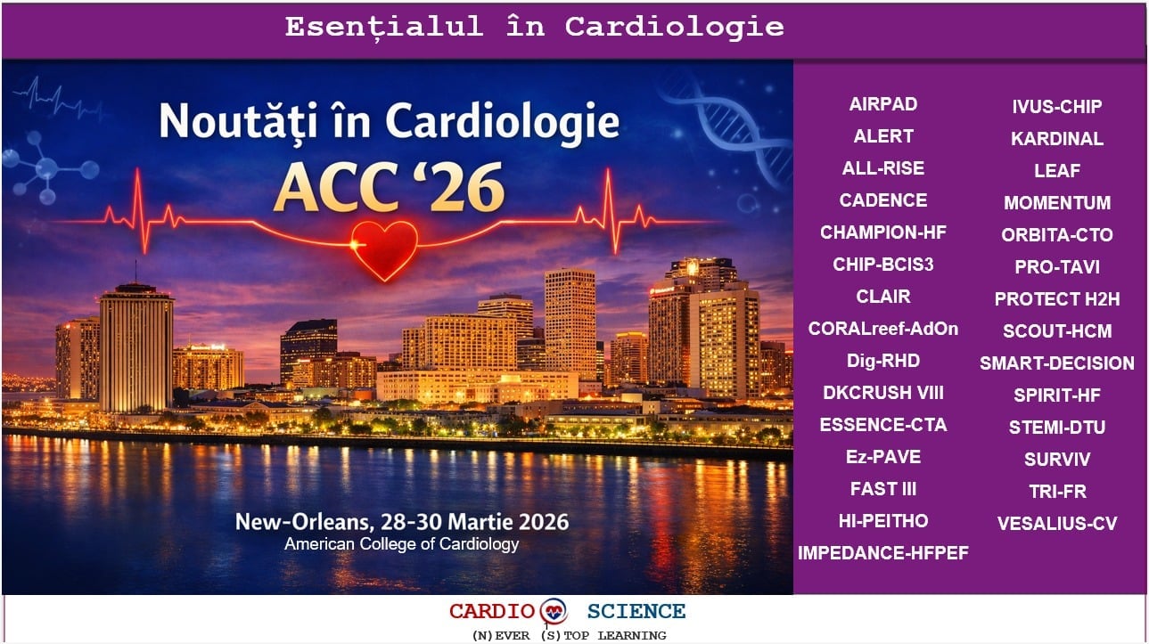 Congresul American College of Cardiology (ACC) 2026 a adus o serie de date noi cu impact direct asupra practicii clinice: studii randomizate, actualizări de ghiduri și noi direcții terapeutice. Acest material oferă o analiză sintetică și structurată cu comentarii sintetice într-un material video de 80 minute concentrată exclusiv pe informațiile cu relevanță practică.